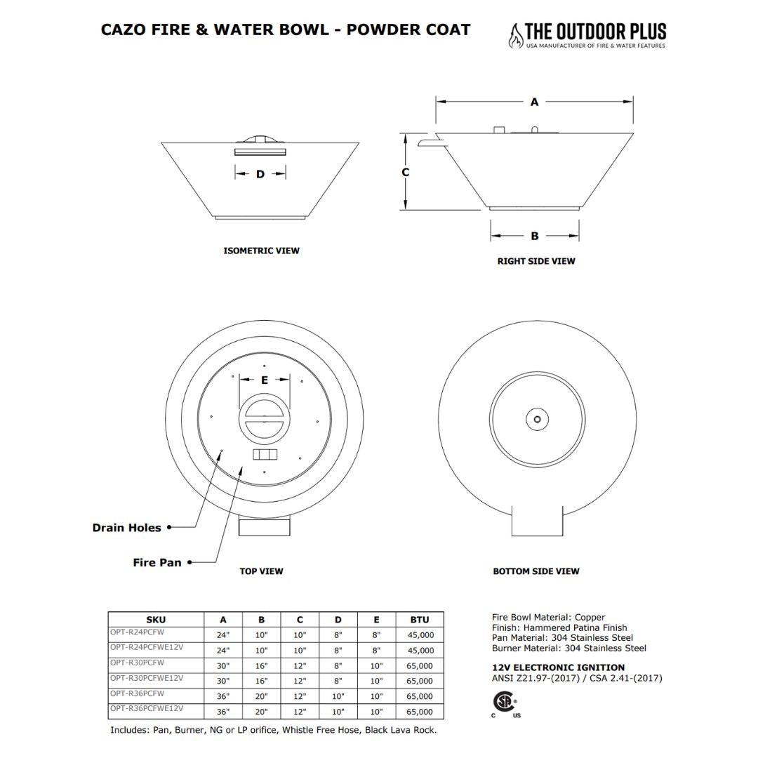 • Dimensions: Upper Diameter: 36", Base Diameter: 20", Height: 12", Burner: 12".