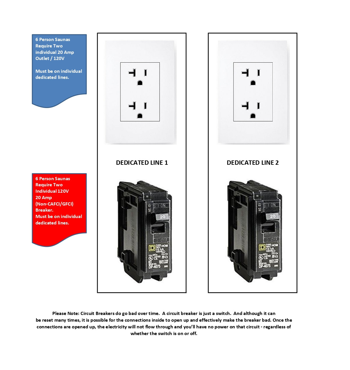 - 6-person sauna: Requires 2 dedicated 20-amp/120-volt electrical circuits and 2 dedicated 20-amp wall outlets.