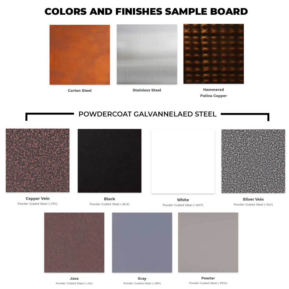 - Finish: Powdercoat steel 9available in 15 colors) Stainless Steel, Corten Steel or Hammered Copper. Copper will change its color into a blue/green hue over time due to its natural properties and surrounding environment.